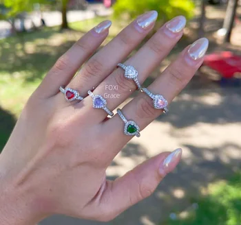 FOXI Chunky Silver Ring Jewelry Women S925 Sterling Silver 5A Quality Colorful Heart Shaped Zircon 925 Silver Rings