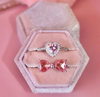 foxi SilverJewelry Bow Rings Luxury Cubic Zirconia White Gold Plated 925 Sterling Silver pink Heart Ring for Women