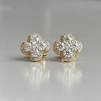 Real 10K 14K 18k Gold Moissanite Flower Cluster Halo Studs 925 Silver Screw Back Statement Clover Stud Earrings for Women Girls