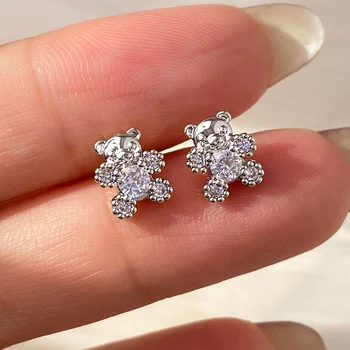 Classic Zirconia Starry Sparkling Cute Thailand 925 Sterling Silver Stud Earrings Bear Shape 18k Gold Plated for Daily Wearing